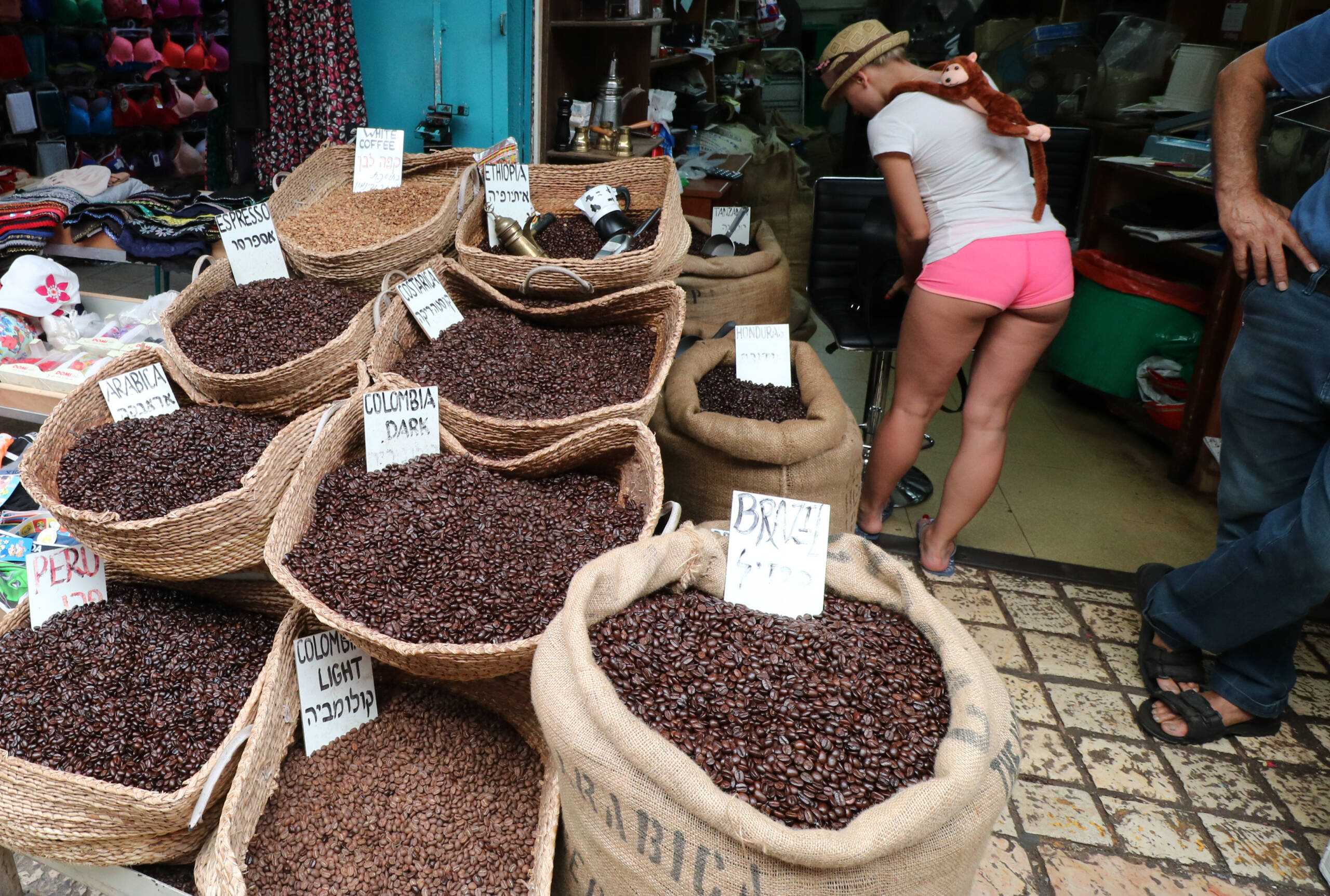 To the left, the market bursts with colors: stacks of woven textiles, hats, and garments spill from shopfronts, a reminder of how coffee markets are rarely just about coffee but part of a broader sensory experience. On the right, the little coffee shop interior feels alive with everyday motion—a woman leans forward with a playful stuffed monkey perched on her back, as if the lighthearted spirit of the market itself climbed aboard. Behind her, the clutter of grinders, scales, and scoops suggests that this is not just a place to look at beans but to take home freshly ground coffee, tailored to taste.